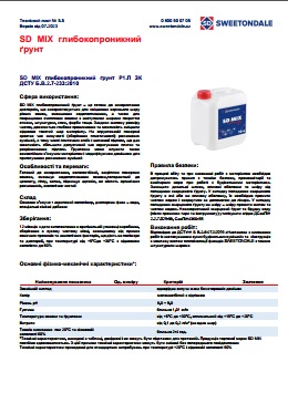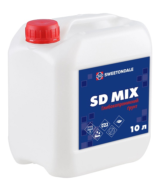 SD MIX глибокопроникний ґрунт – це готова до використання дисперсія, що використовується для зміцнення верхнього шару різних основ, зменшення водопоглинання, а також для покращення зчеплення основи з наступними шарами покриття: стяжки, штукатурки, клея, фарби тощо. Завдяки малому розміру часток, досягається глибоке проникнення та можливість зміцнити відносно товстий шар матеріалу. На огрунтованій поверхні зростає час живучості (зберігання пластичності) розчинових сумішей, в тому числі плиточних клеїв і наливної підлоги, що дає можливість збільшити допустимий час коригування плитки та розрівнювання підлоги. Грунтовка може служити також самостійним в’яжучим матеріалом і модифікуючою домішкою для приготування розчинових сумішей