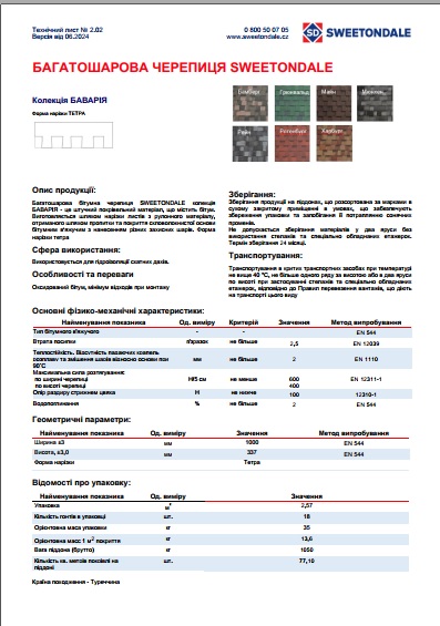 Багатошарова бітумна черепиця SWEETONDALE колекція БАВАРІЯ - це штучний покрівельний матеріал, що містить бітум. Виготовляється шляхом нарізки листів з рулонного матеріалу, отриманого шляхом пропитки та покриття скловолокнистої основи бітумним в'яжучим з нанесенням різних захисних шарів. Форма нарізки тетра