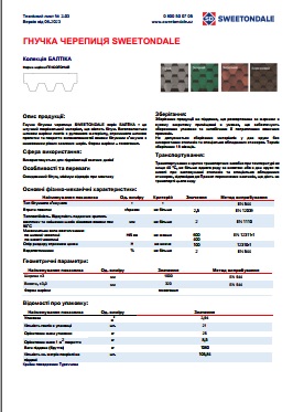 Гнучка бітумна черепиця SWEETONDALE серія БАЛТІКА - це штучний покрівельний матеріал, що містить бітум. Виготовляється шляхом нарізки листів з рулонного матеріалу, отриманого шляхом пропитки та покриття скловолокнистої основи бітумним в'яжучим з нанесенням різних захисних шарів. Форма нарізки – гексогонал.