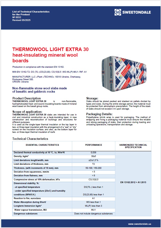 THERMOWOOL LIGHT – це негорючі, гідрофобізовані тепло-, звукоізоляційні плити з мінеральної вати на основі гірських порід базальтової групи.