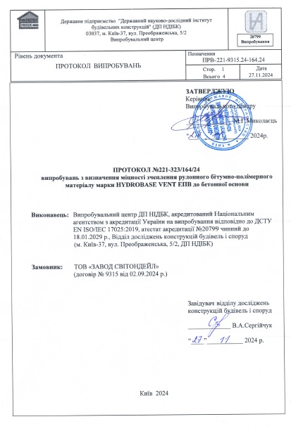 HYDROBASE VENT ЕКВ – складається з основи з поліефірного полотна, вкритою з обох боків бітумно-полімерним в'яжучим, із захисними шарами зверху у вигляді крупнозернистої посипки та знизу у вигляді дрібнозернистої посипки. На нижній захисний шар смугами додатково наноситься ще один шар бітумно-полімерного в'яжучого. Для запобігання злипанню матеріалу смужки вкриті полімерною плівкою. Матеріал використовують для влаштування одношарового вентильованого («дихаючого») покрівельного килима.
